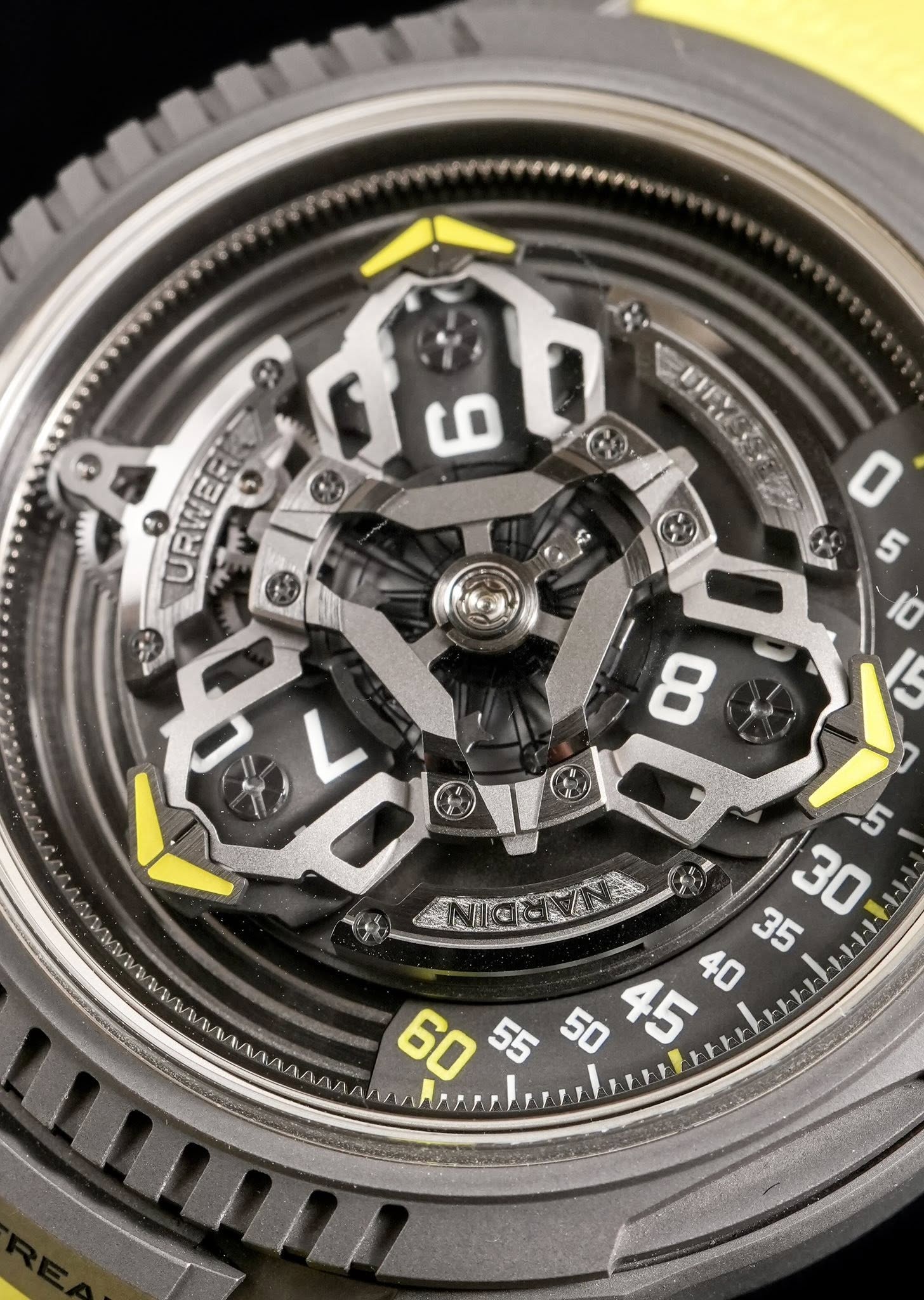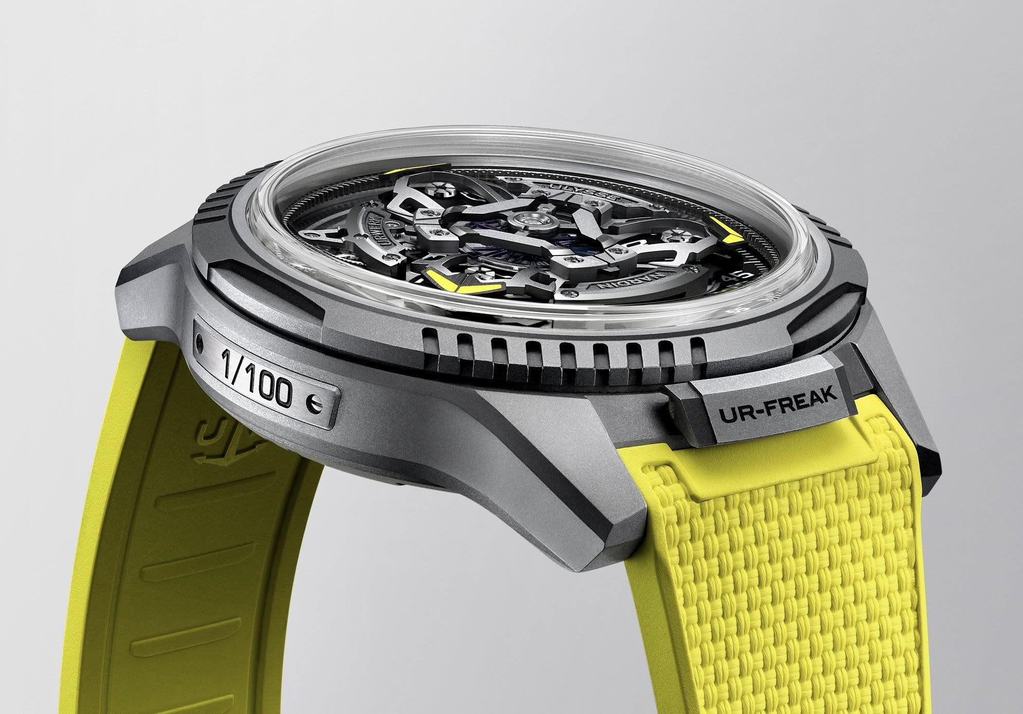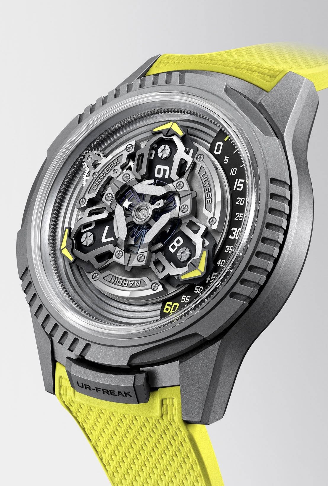 腕錶外觀以雅典Freak One的44毫米錶殼為基礎,採用鈦金屬材質,並融入URWERK的深碳灰色噴砂處理與電光黃色細節。腕錶無傳統錶冠,透過旋轉錶圈調時,錶背亦可轉動以手動上鍊,防水深度為30米。