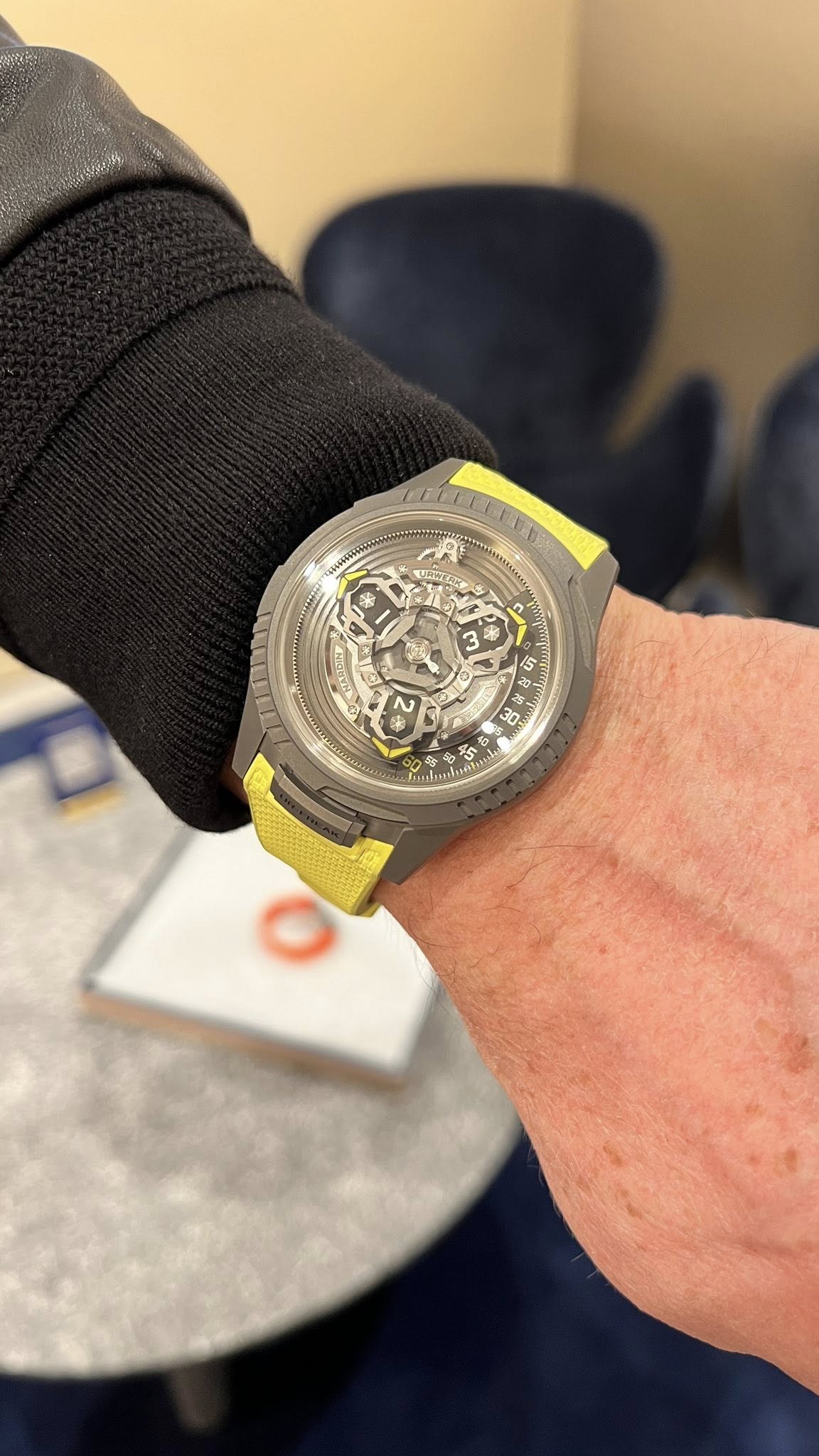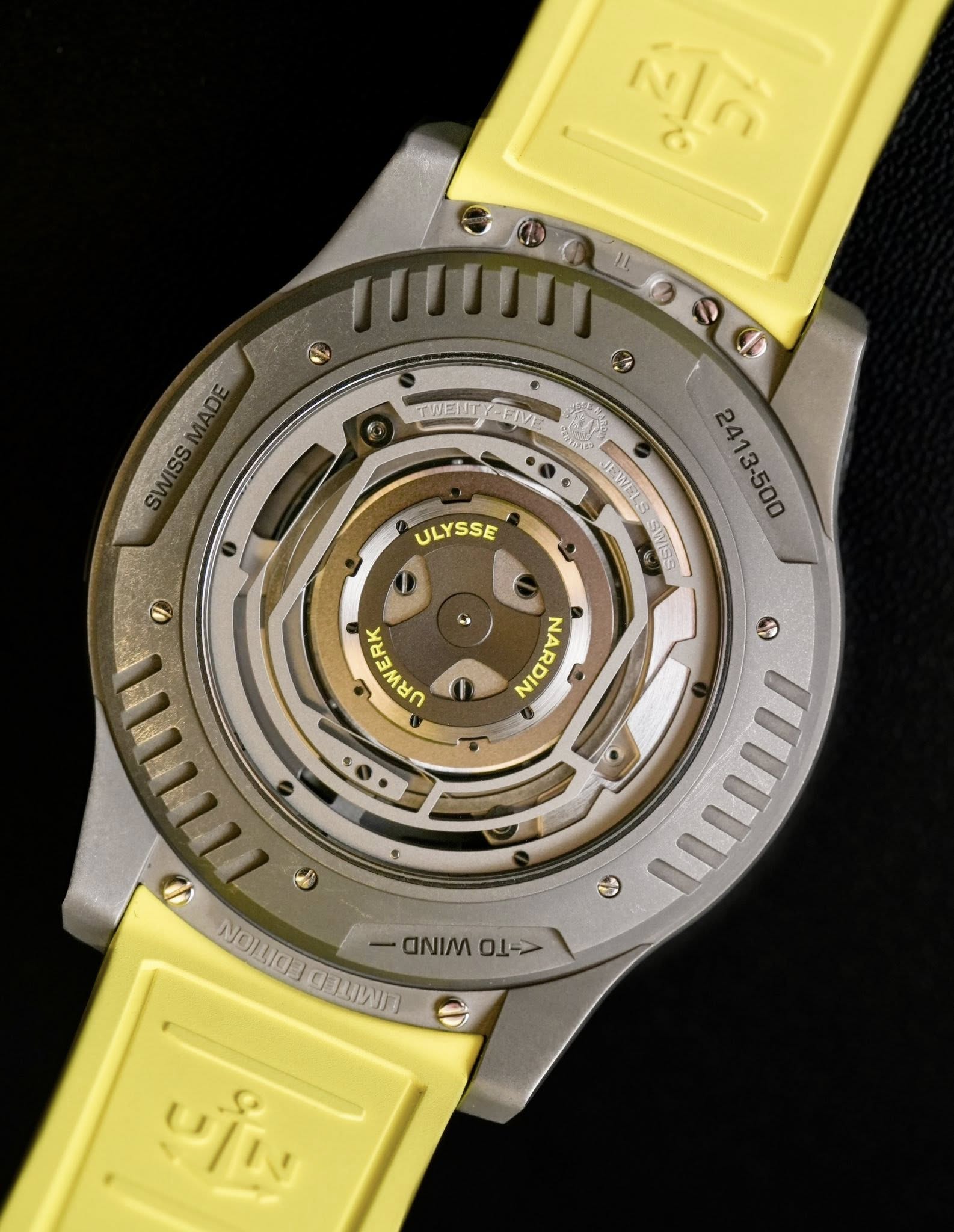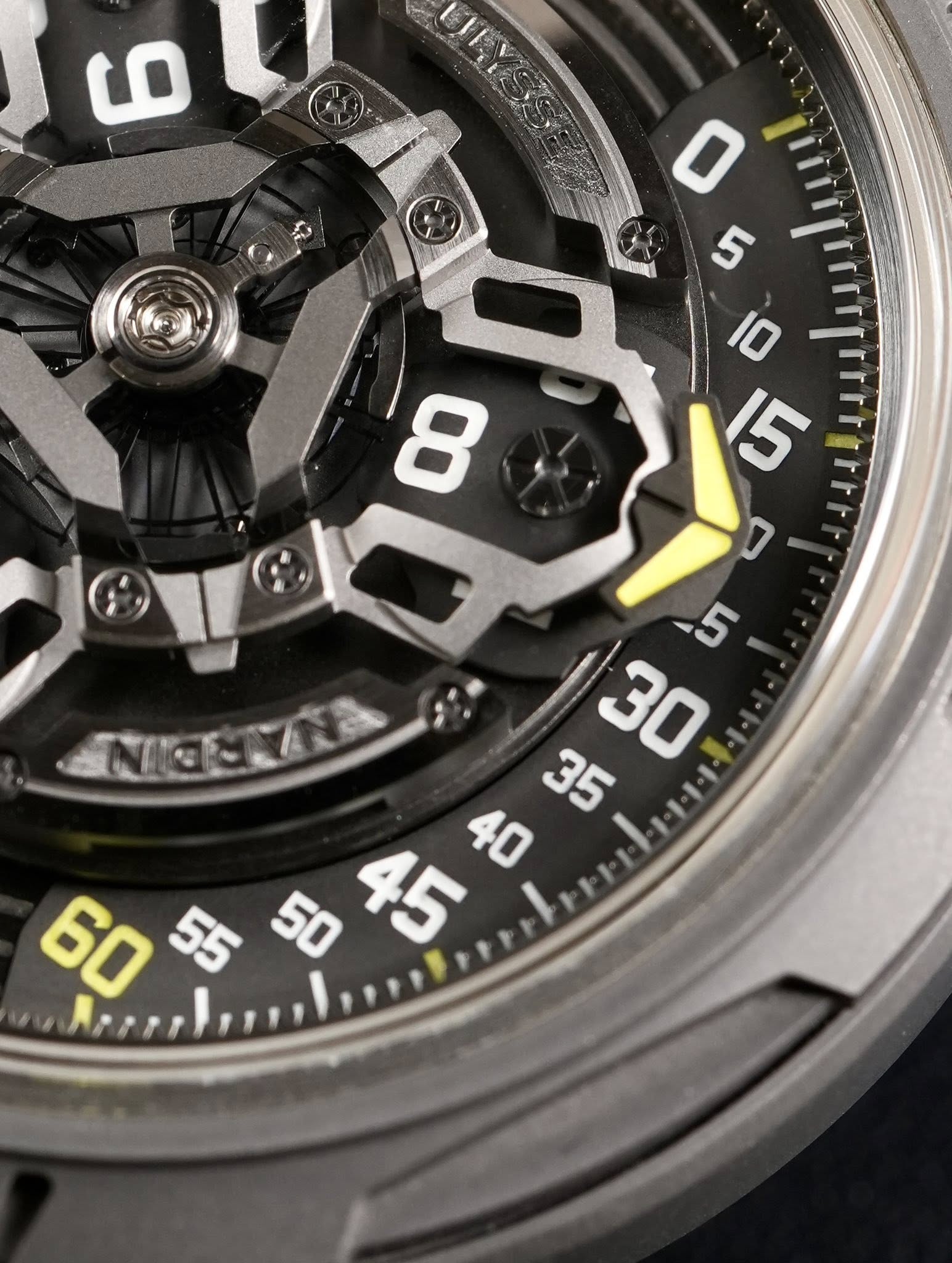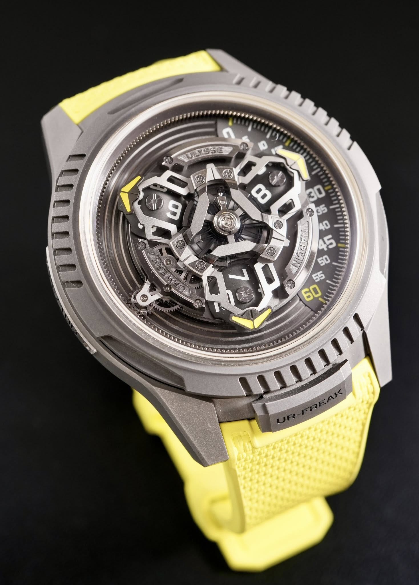 腕錶外觀以雅典Freak One的44毫米錶殼為基礎,採用鈦金屬材質,並融入URWERK的深碳灰色噴砂處理與電光黃色細節。腕錶無傳統錶冠,透過旋轉錶圈調時,錶背亦可轉動以手動上鍊,防水深度為30米。