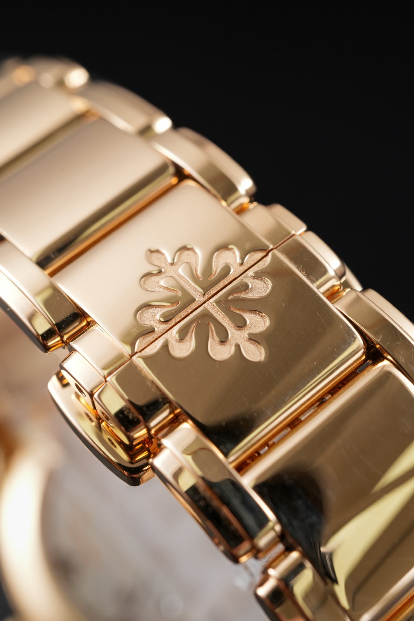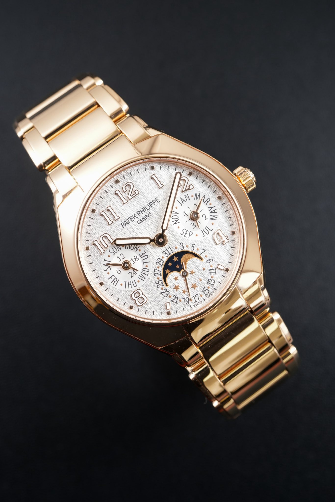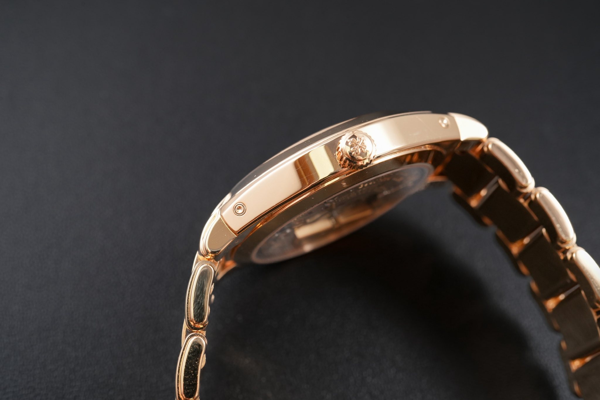 錶殼全經拋光處理,蘊藏2409自動上弦超薄(3.88毫米)萬年曆機芯,讓腕錶外形得以優雅纖薄(9.95毫米)。機芯細節在剔透的藍寶石水晶錶殼底蓋下一覽無遺;有賴機芯裝置,造就出以指針展示的日曆顯示,成為百達翡麗萬年曆腕錶之中最鮮明可辨的錶面之一:星期及24小時顯示位於錶面9時位置;日期顯示處於6時位置:月份及閏年週期顯示位於3時位置,加上指針式日期顯示中間的月相顯示窗,相得益彰。腕錶提供星期、日期和月份全日曆顯示,當中已顧及月份長短,包括閏年。立體阿拉伯數字搭配巴頓式圓角指針,全以玫瑰金製成,並添上白色夜光塗層,不論晝夜皆清晰讀時。錶冠綴以百達翡麗的卡勒卓華十字星標徽。