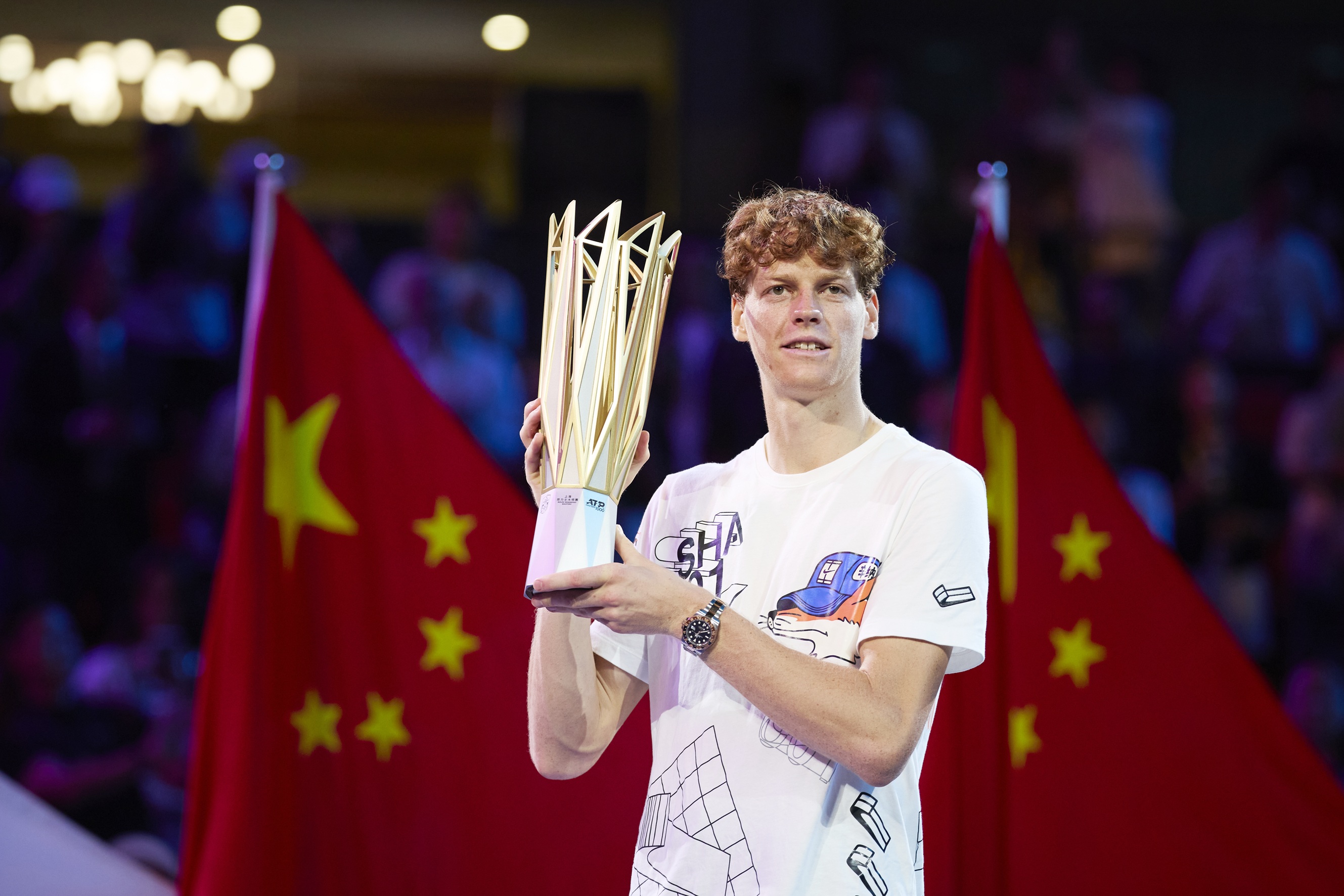 劳力士代言人詹尼克·辛纳手捧2024年上海劳力士大师赛冠军奖杯