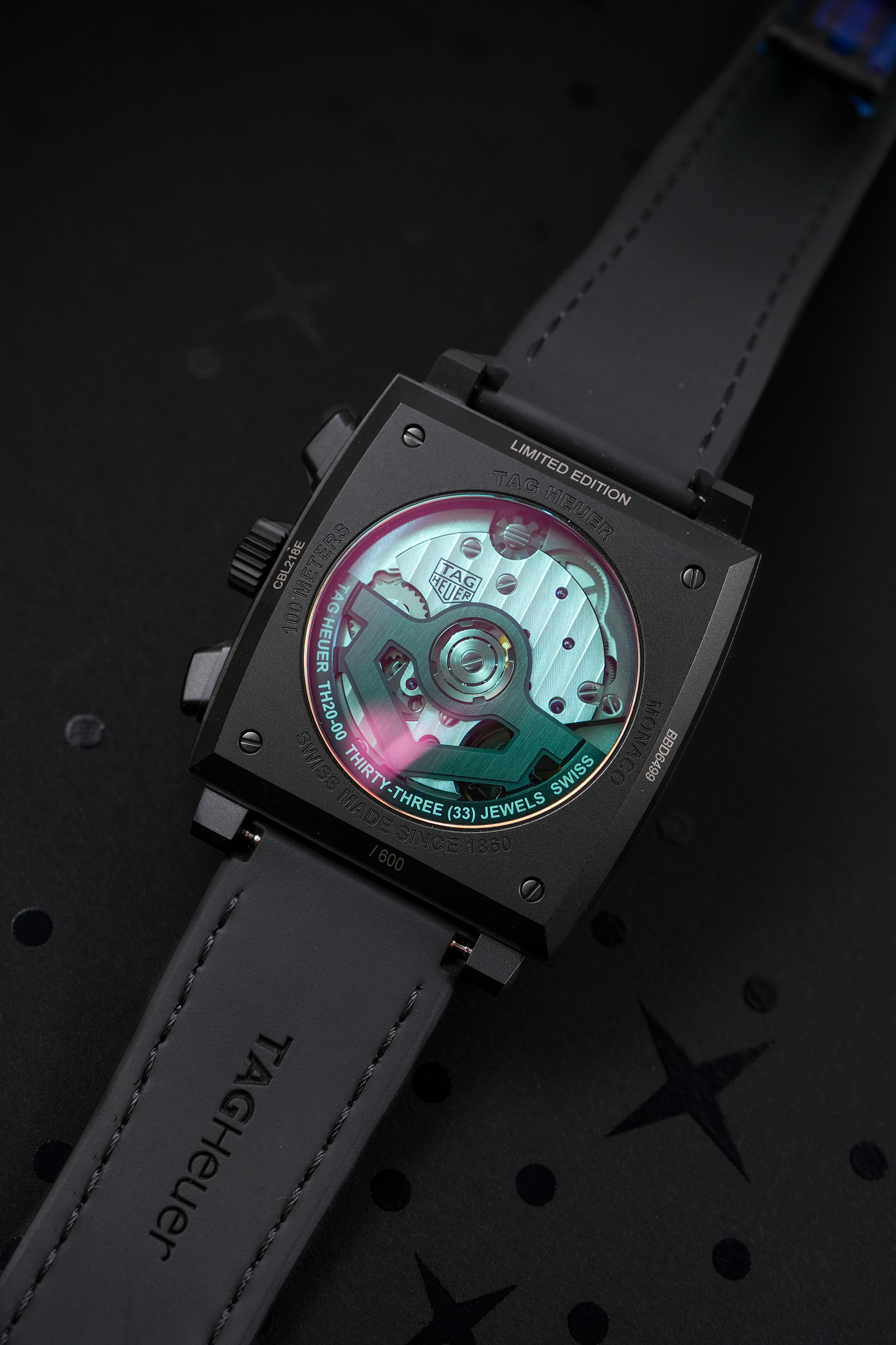 內部搭載品牌自製的Calibre TH20-00自動上鏈機芯,透過鏤空錶盤與藍寶石水晶底蓋可欣賞其精密運作。 錶帶結合黑色橡膠與壓紋小牛皮,配以紫色縫線,完美呼應整體設計。 此作將Monaco系列標誌性的方形錶殼與左置表冠融入夜賽美學,為這款自1969年問世、經Steve Mcweeney佩戴而聲名大噪的經典時計,書寫出充滿現代感的夜色新章。