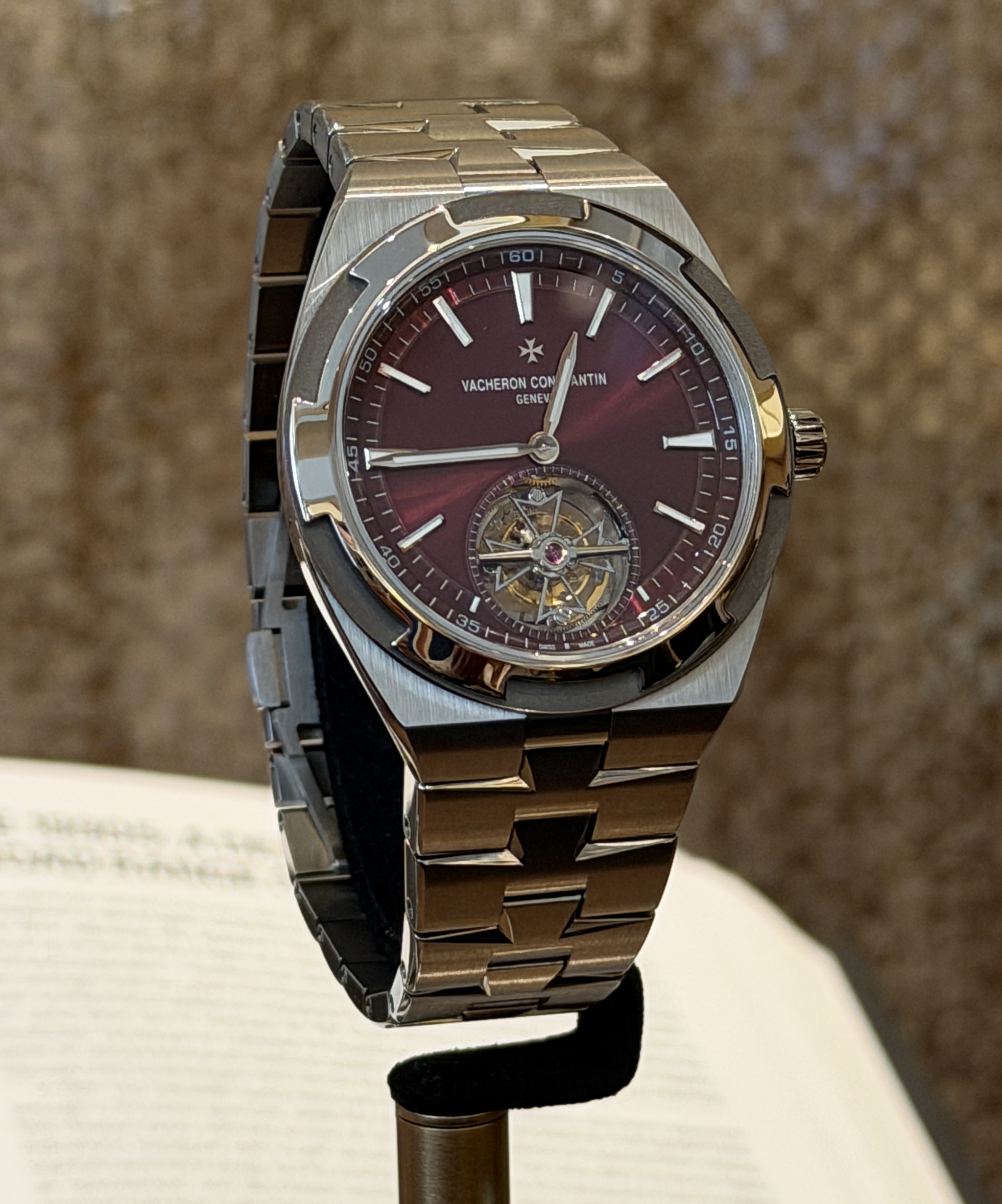 Vacheron Constantin江詩丹頓為 Overseas 系列推出首款鈦金屬搭配深紅色表盤的陀飛輪腕表,以輕盈堅固的材質與嶄新色彩演繹高級製表美學。鈦金屬比鋼輕一半、強度卻提升30%,完美契合系列休閒優雅的氣質。表殼厚度僅10.39毫米,經細緻打磨,融合緞面拉絲與拋光倒角,襯托纖薄輪廓。