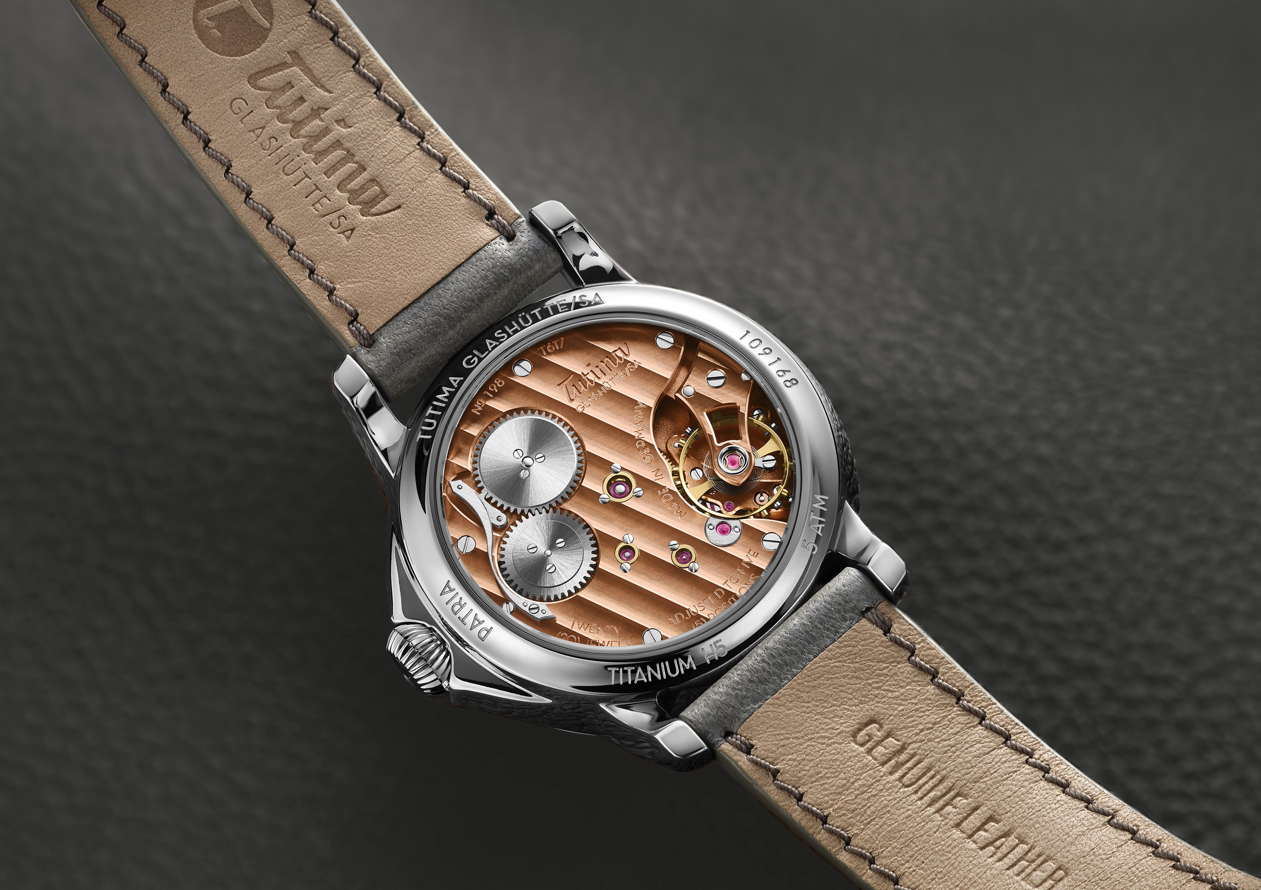 除了堅固精準的專業時計,近年Tutima亦會生產一系列包括陀飛輪、三問等的高複雜功能腕表。除了複雜功能,Tutima亦推出了擁有高級手工打磨機芯的經典款腕表,Patria是其中很受歡迎的系列。用5級鈦合金打造表殼的Patria,擁有鈦合金輕盈、堅固和不會讓皮膚過敏的特性。基本圓形的表殼有別於傳統三層式的設計,而是只有表圈和主表殼兩個部份,好處是讓腕表更加纖薄,配合微微弧形的表耳,讓佩戴手感更加舒適。有別於一般的經典圓形腕表設計,Patria擁有一個頗為突出的表冠護橋,讓較大的表冠在手動上鏈時運作更加暢順和手感更加絲滑。